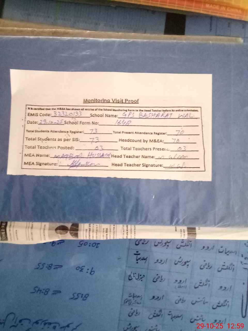 | Attendance Register | Head Teacher | MEA with School | Visit Proof |