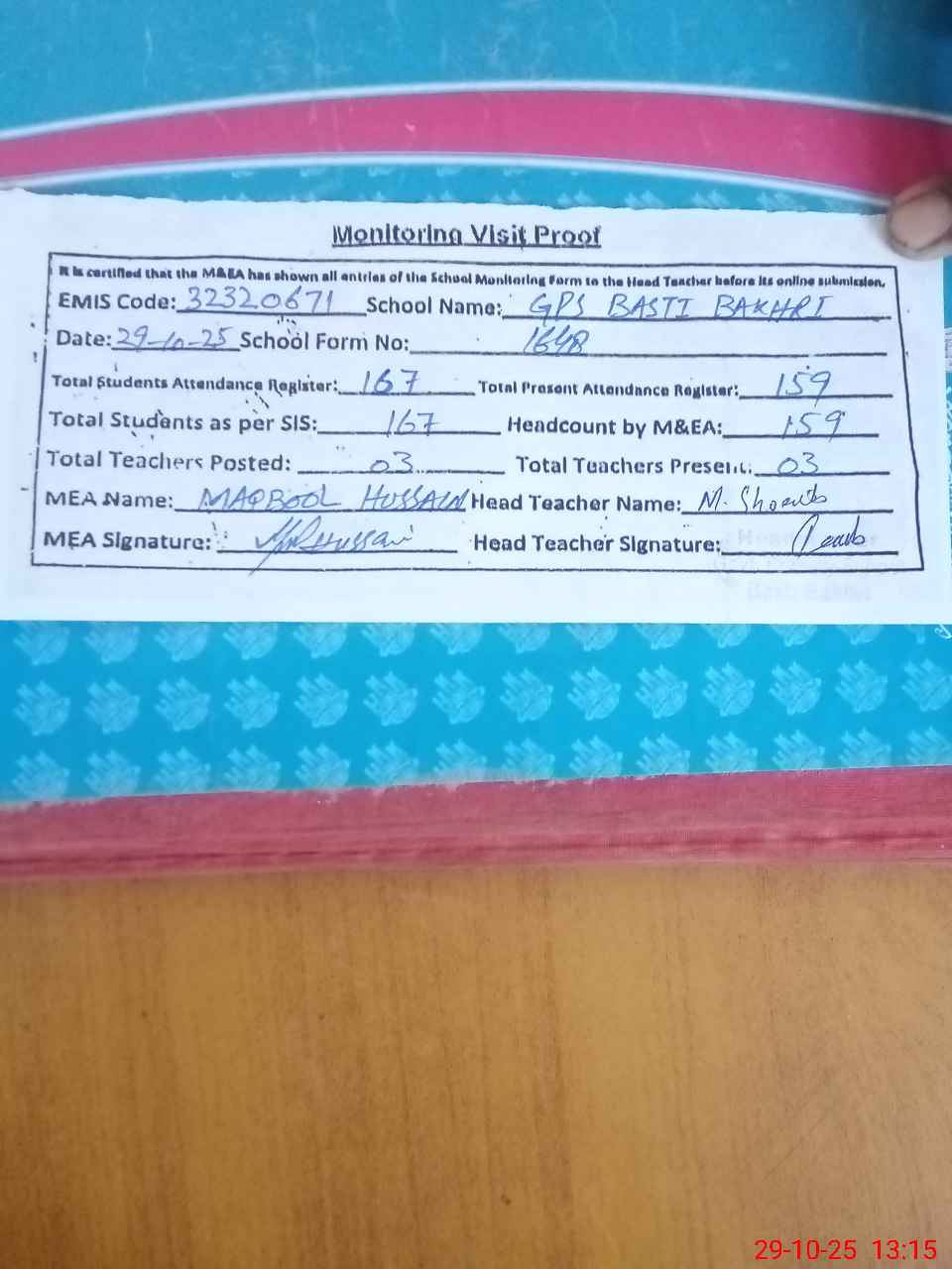 | Attendance Register | Head Teacher | MEA with School | Visit Proof |