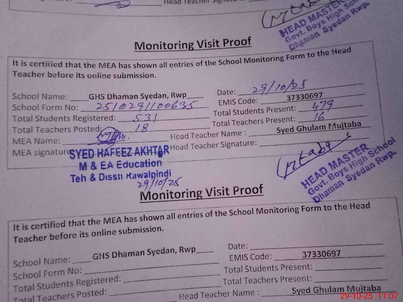 | Certified that this School was Inspected by the Undersigned MEA/DMO Today and the Information Stated Above is as Per Record. | |||||