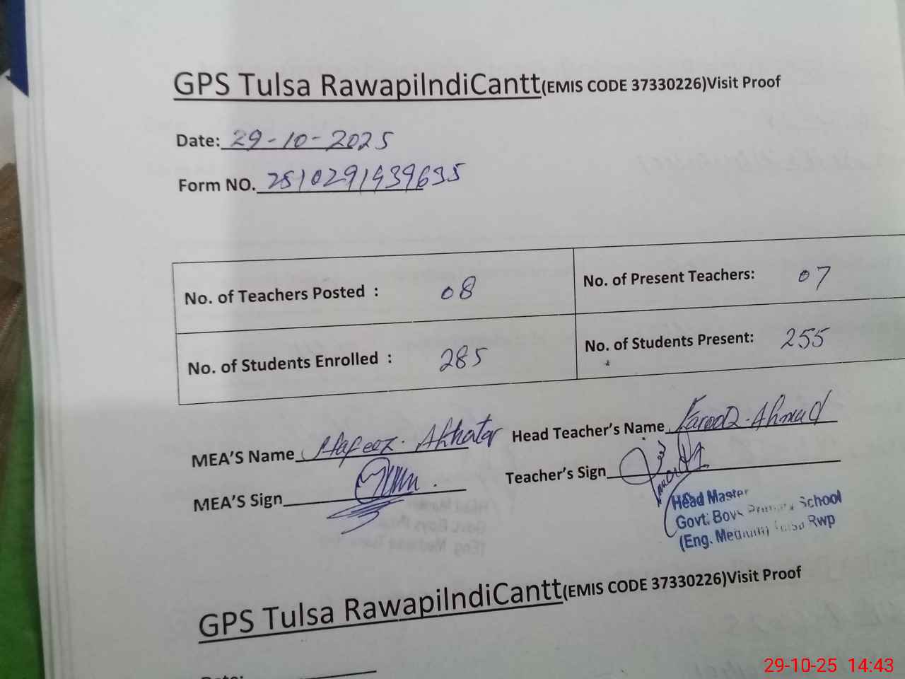 | Certified that this School was Inspected by the Undersigned MEA/DMO Today and the Information Stated Above is as Per Record. | |||||