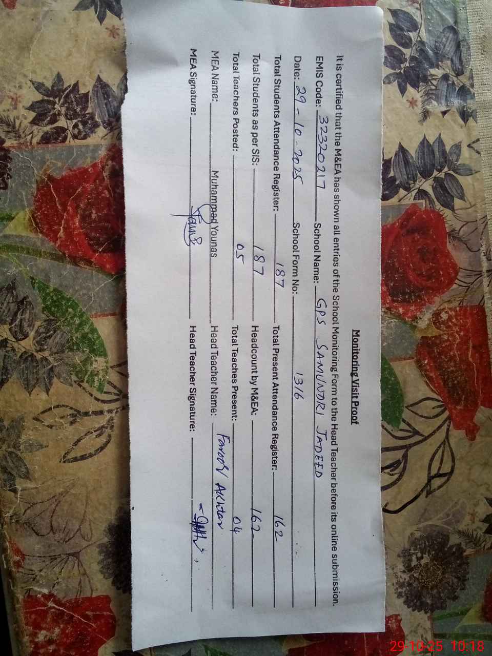 | Attendance Register | Head Teacher | MEA with School | Visit Proof |