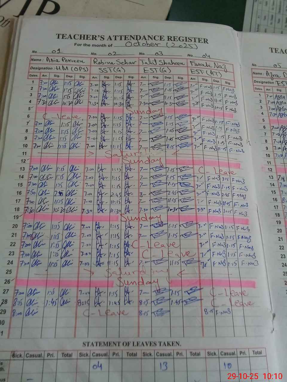 | 54**** | Ur**** Ak**** | 1 | 0 | 0 | 30 | 0 | 0 | 0 | 0 | 0 | 0 | Absent (Un-Authorized) | |