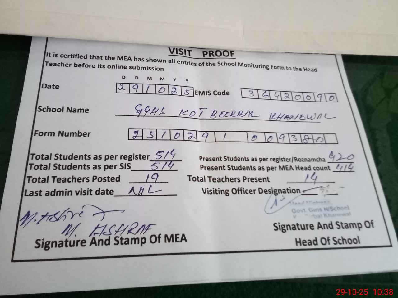 | Attendance Register | Head Teacher | MEA with School | Visit Proof |
