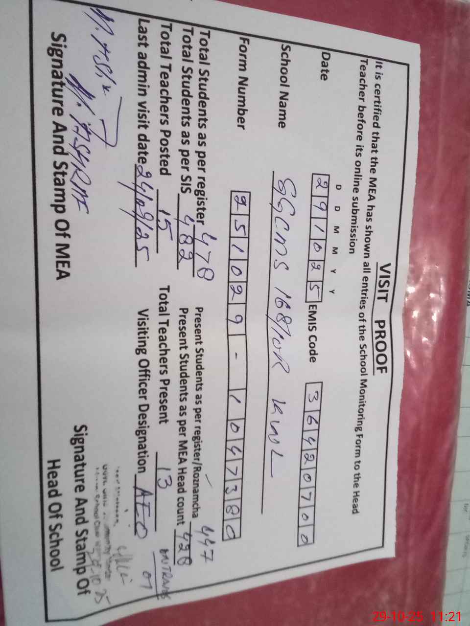 | Certified that this School was Inspected by the Undersigned MEA/DMO Today and the Information Stated Above is as Per Record. | |||||