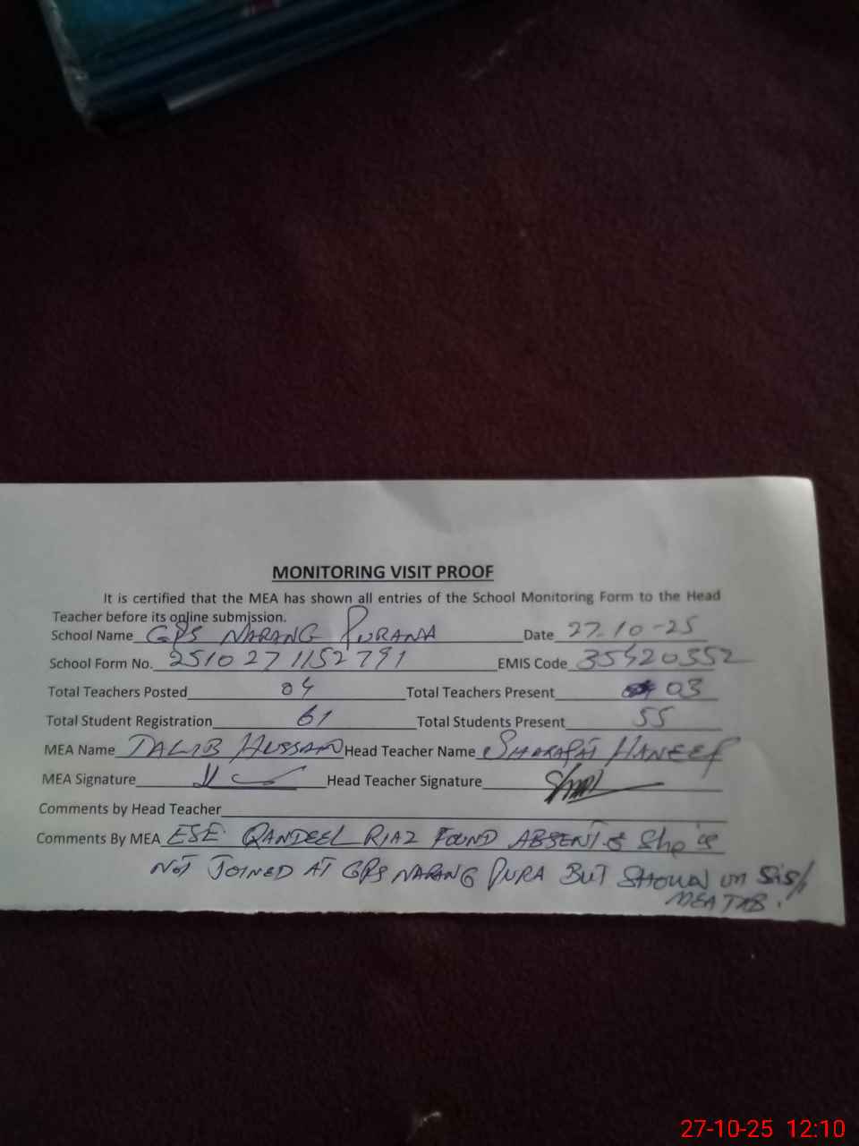 | Remarks (Use Separate Page if Required): ESE Qanderl Riaz posted at GPS Narang pura but yet not joined at school and she was found absent Her Name is shown on SIS at GPS Narang purana strictly action may please be taken against her habitual absent teacher | |||||