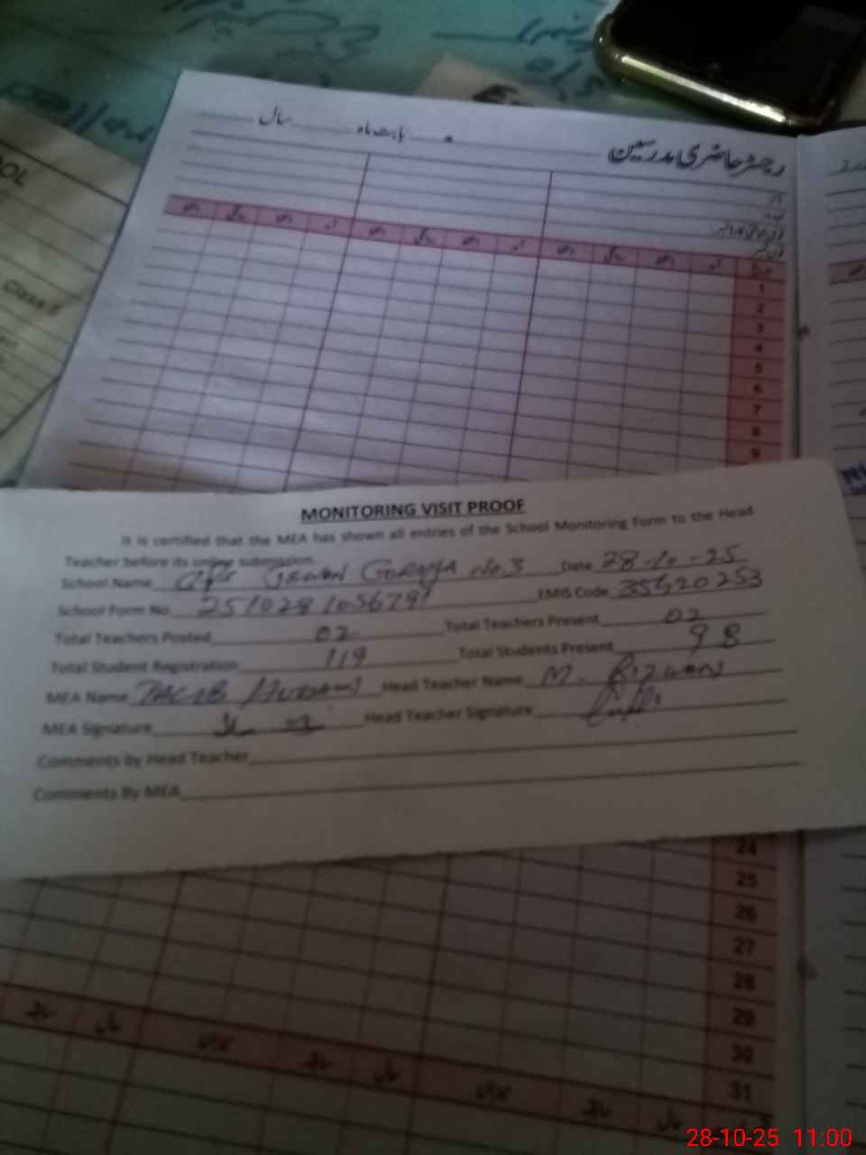| Attendance Register | Head Teacher | MEA with School | Visit Proof |