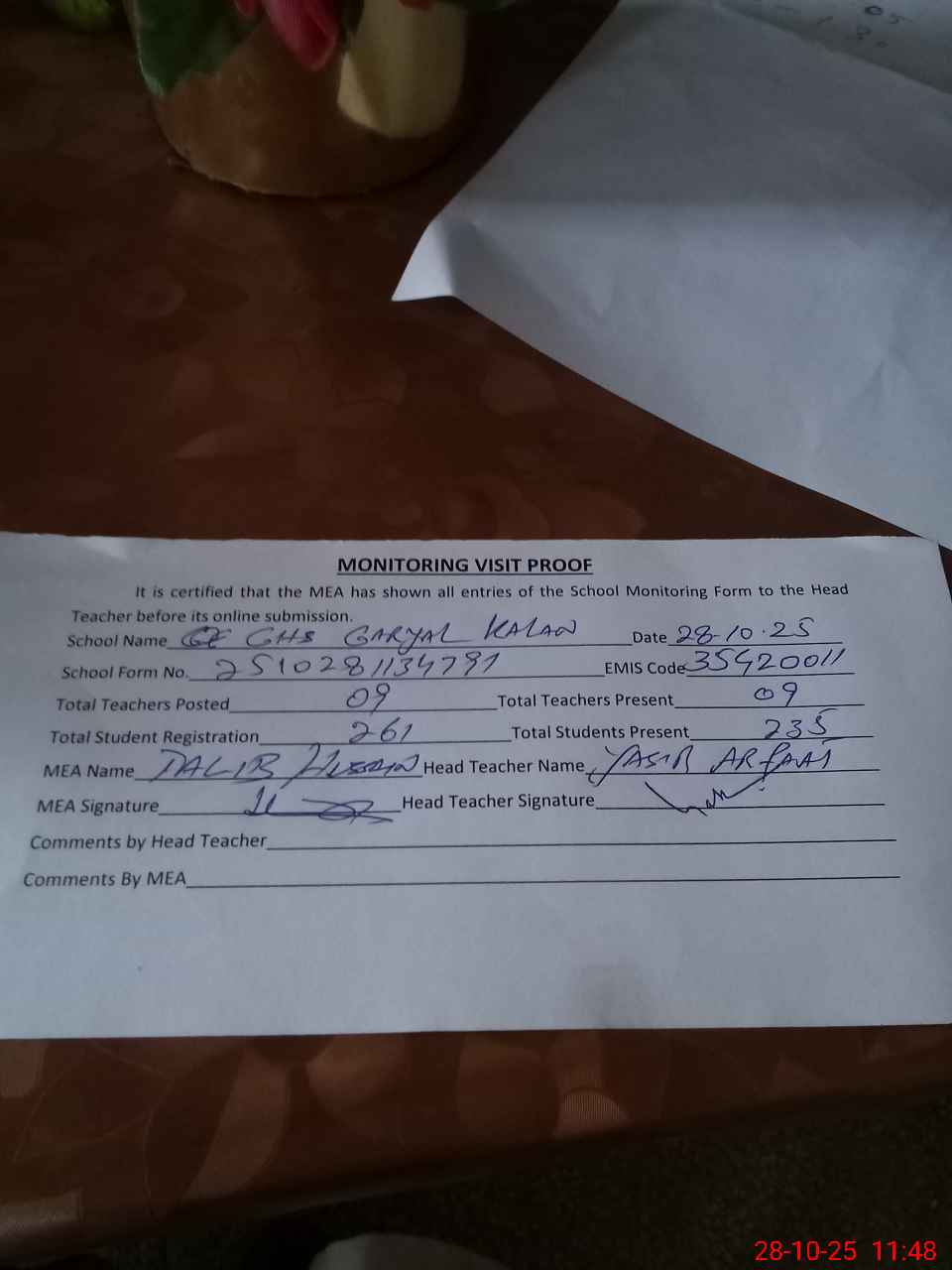 | Attendance Register | Head Teacher | MEA with School | Visit Proof |