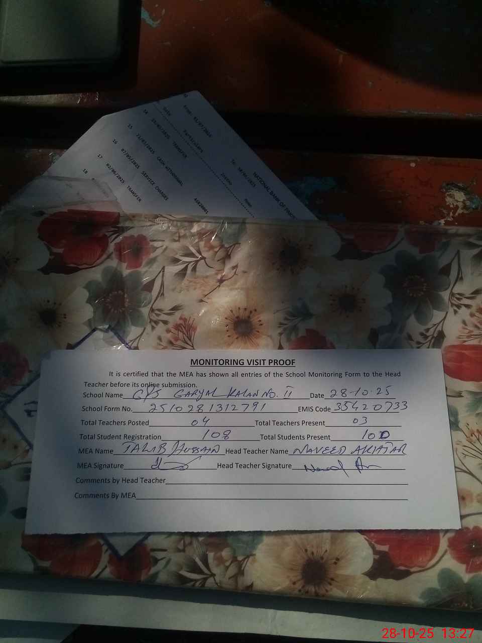 | Attendance Register | Head Teacher | MEA with School | Visit Proof |