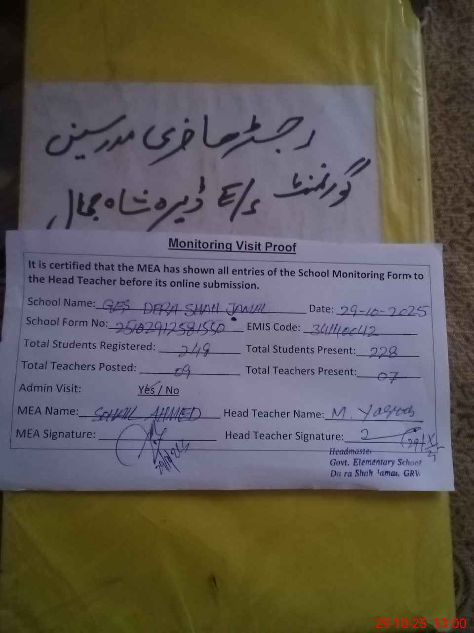 | Attendance Register | Head Teacher | MEA with School | Visit Proof |