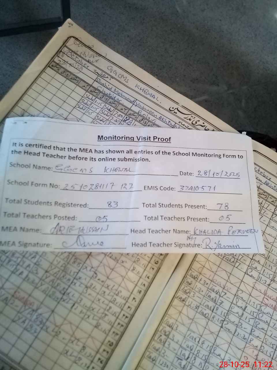 | Attendance Register | Head Teacher | MEA with School | Visit Proof |
