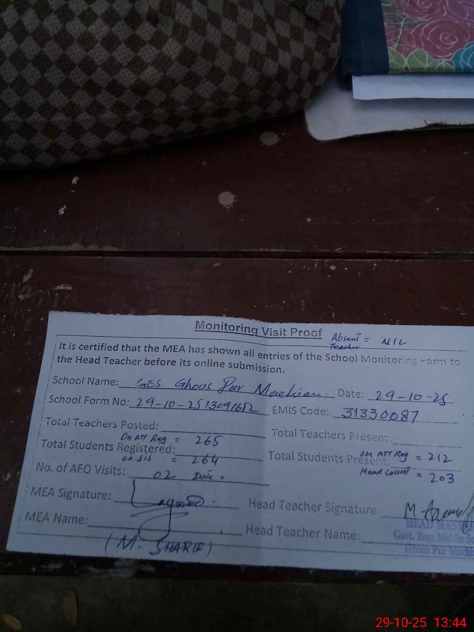 | Attendance Register | Head Teacher | MEA with School | Visit Proof |