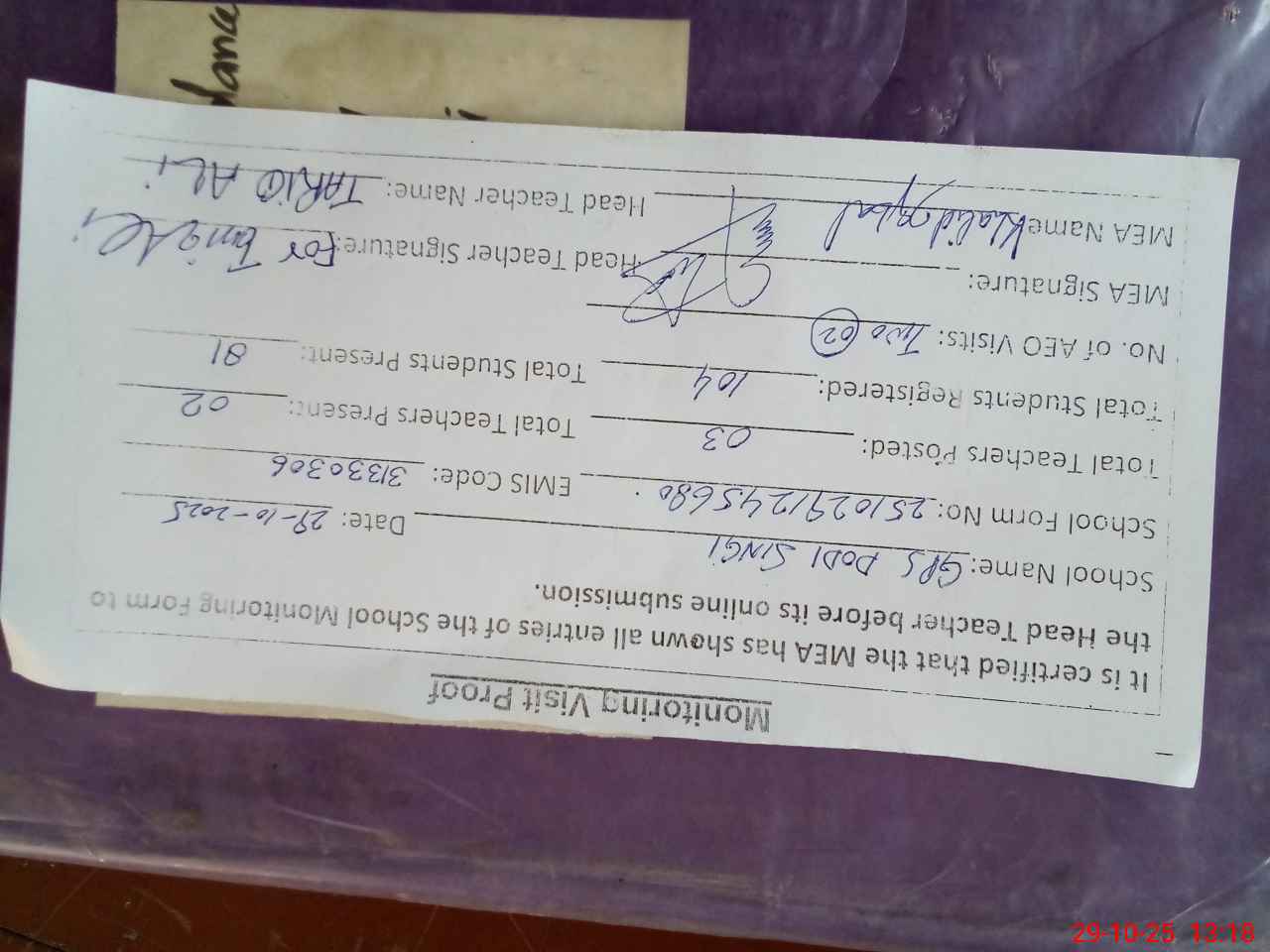 | Attendance Register | Head Teacher | MEA with School | Visit Proof |