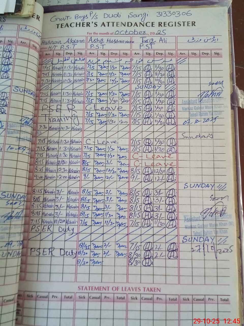 | CNIC | Full Name | Designation | R/C | Absence During Last Calender Month |