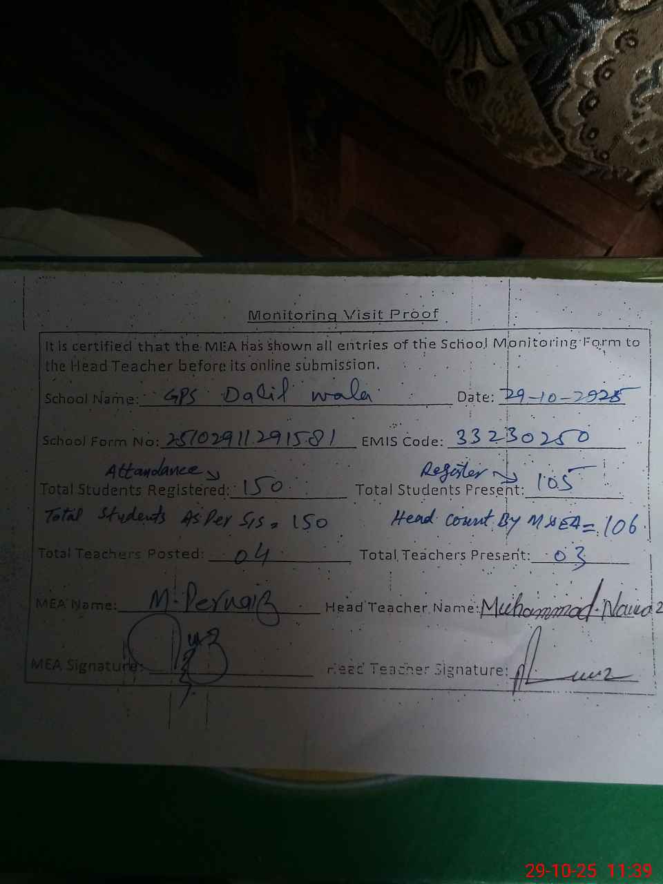 | Attendance Register | Head Teacher | MEA with School | Visit Proof |