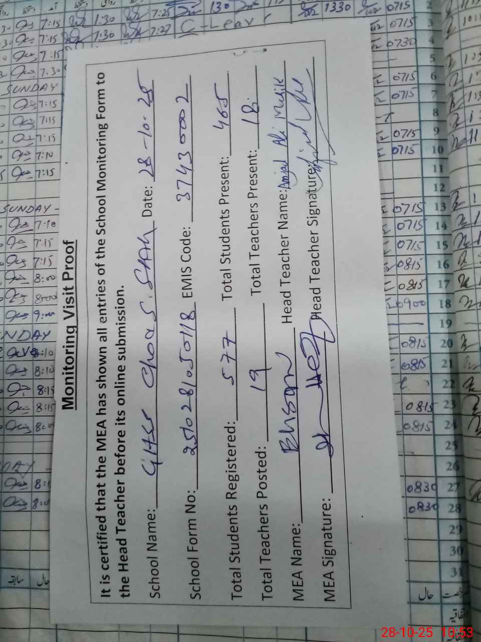 | Attendance Register | Head Teacher | MEA with School | Visit Proof |