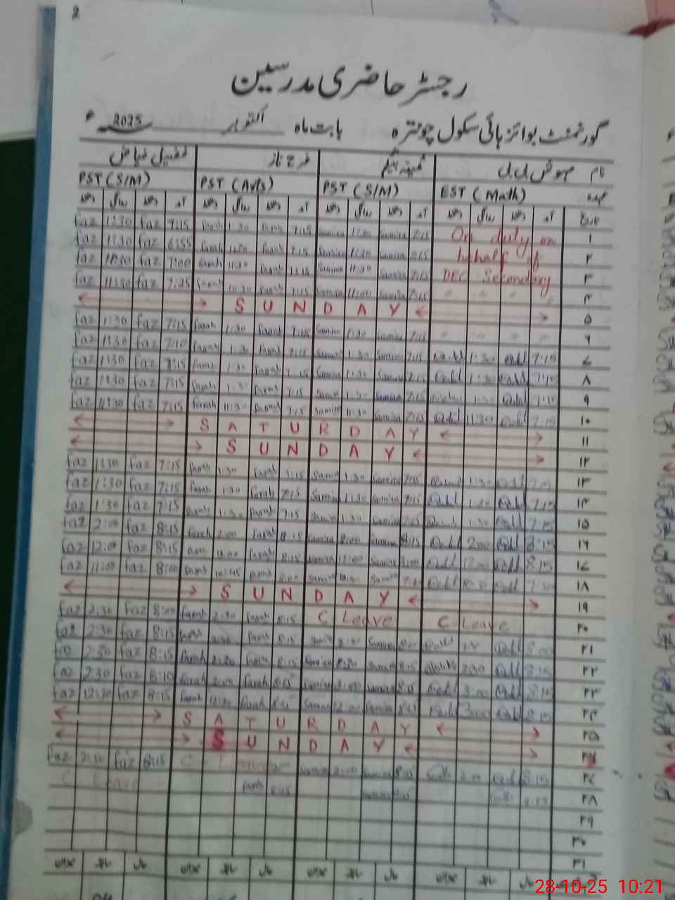 | Leave | Duty | Absent | Maternity | Medical | Ex- Pak |