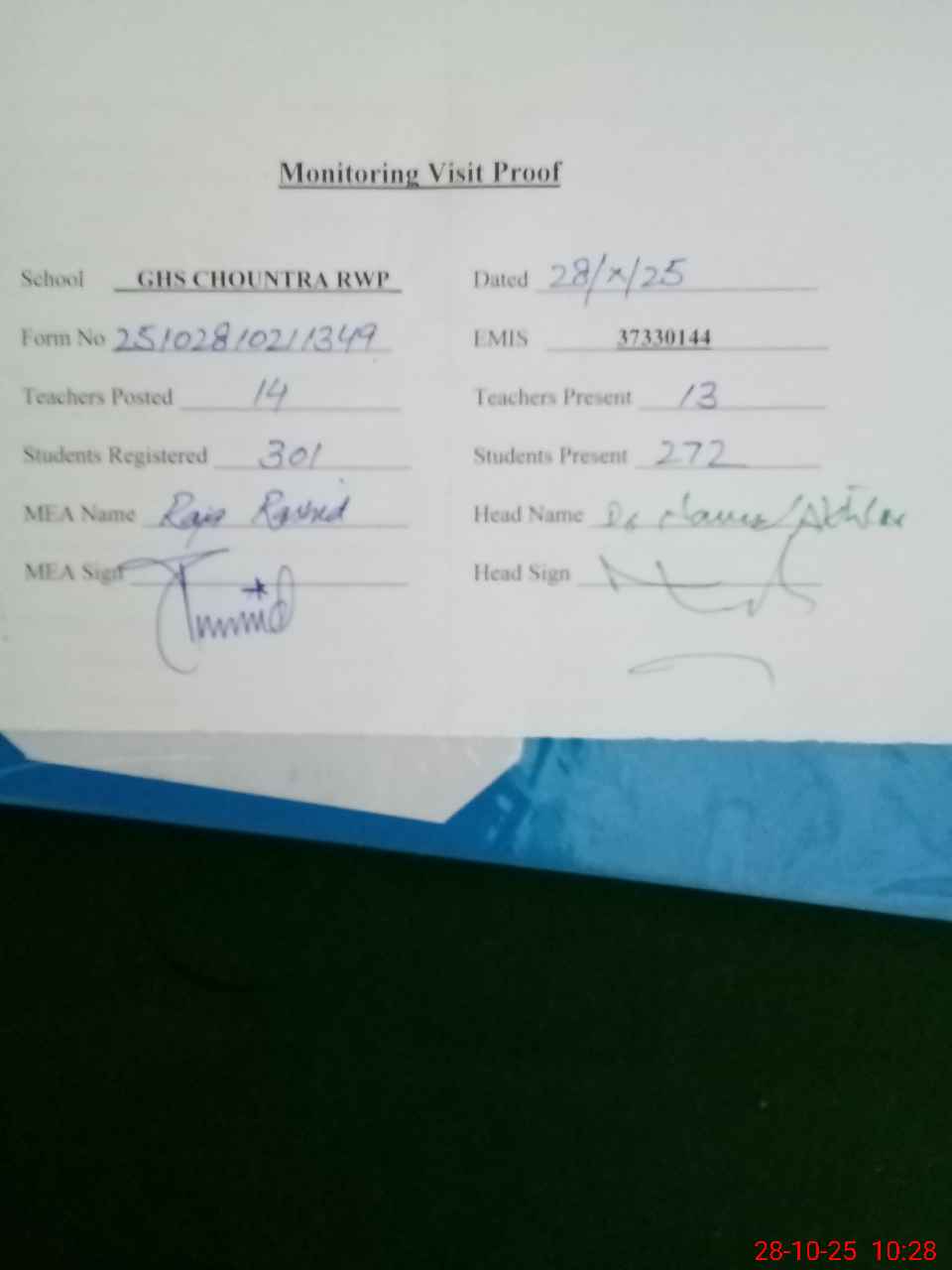 | Attendance Register | Head Teacher | MEA with School | Visit Proof |
