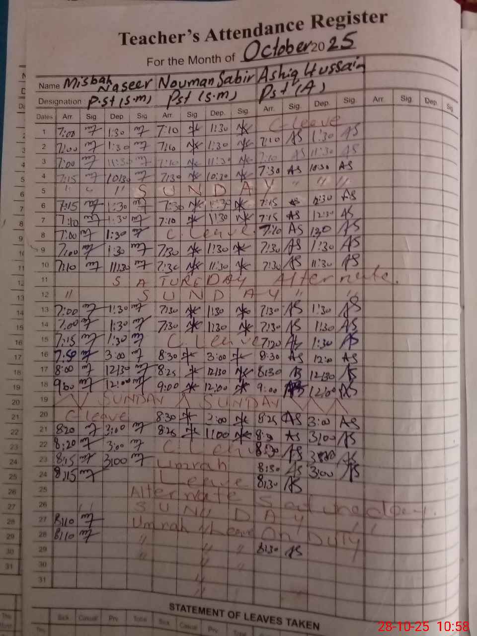 | Leave | Duty | Absent | Maternity | Medical | Ex- Pak |