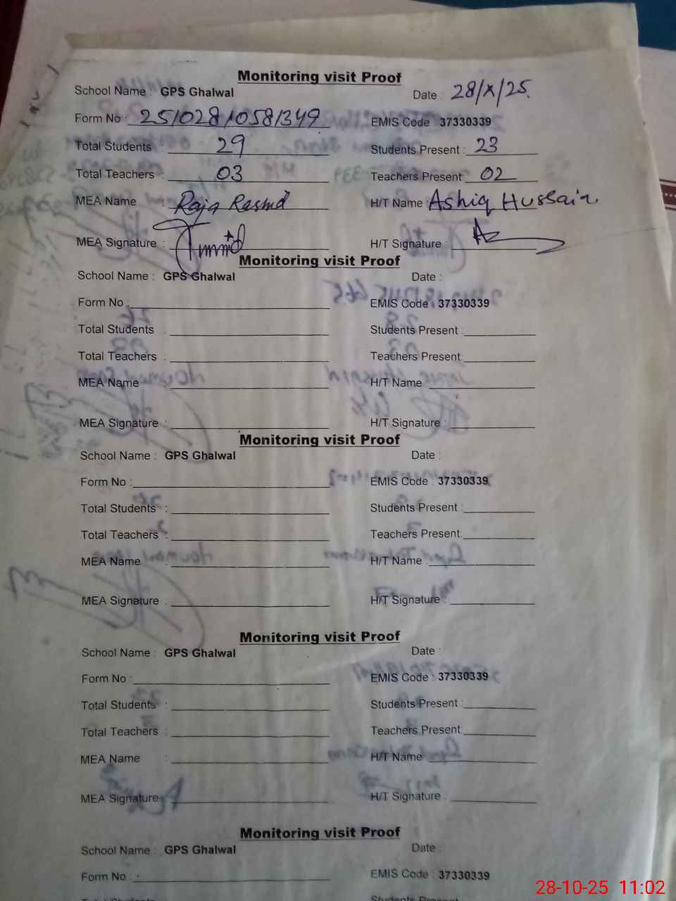 | Attendance Register | Head Teacher | MEA with School | Visit Proof |
