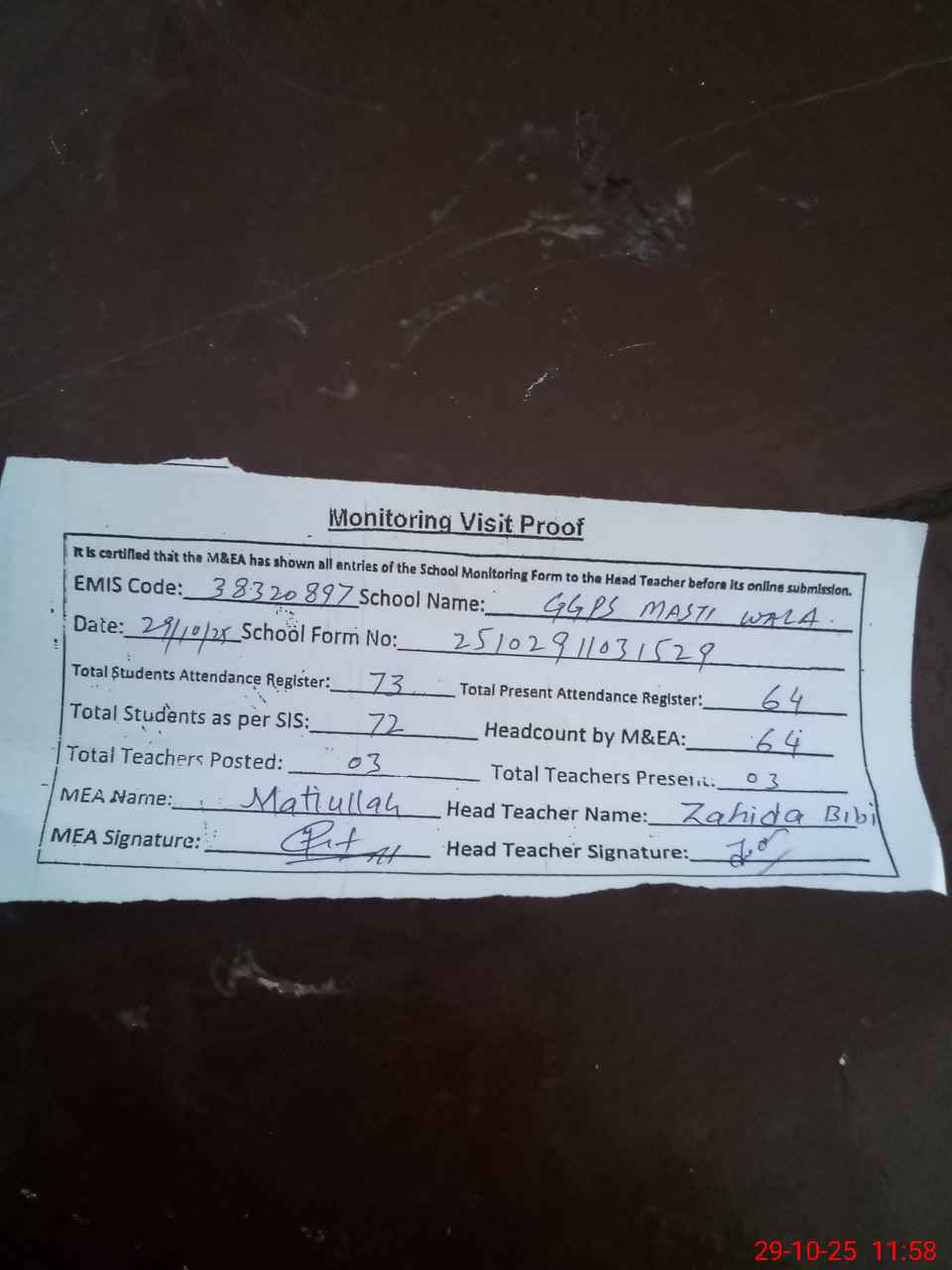 | Attendance Register | Head Teacher | MEA with School | Visit Proof |
