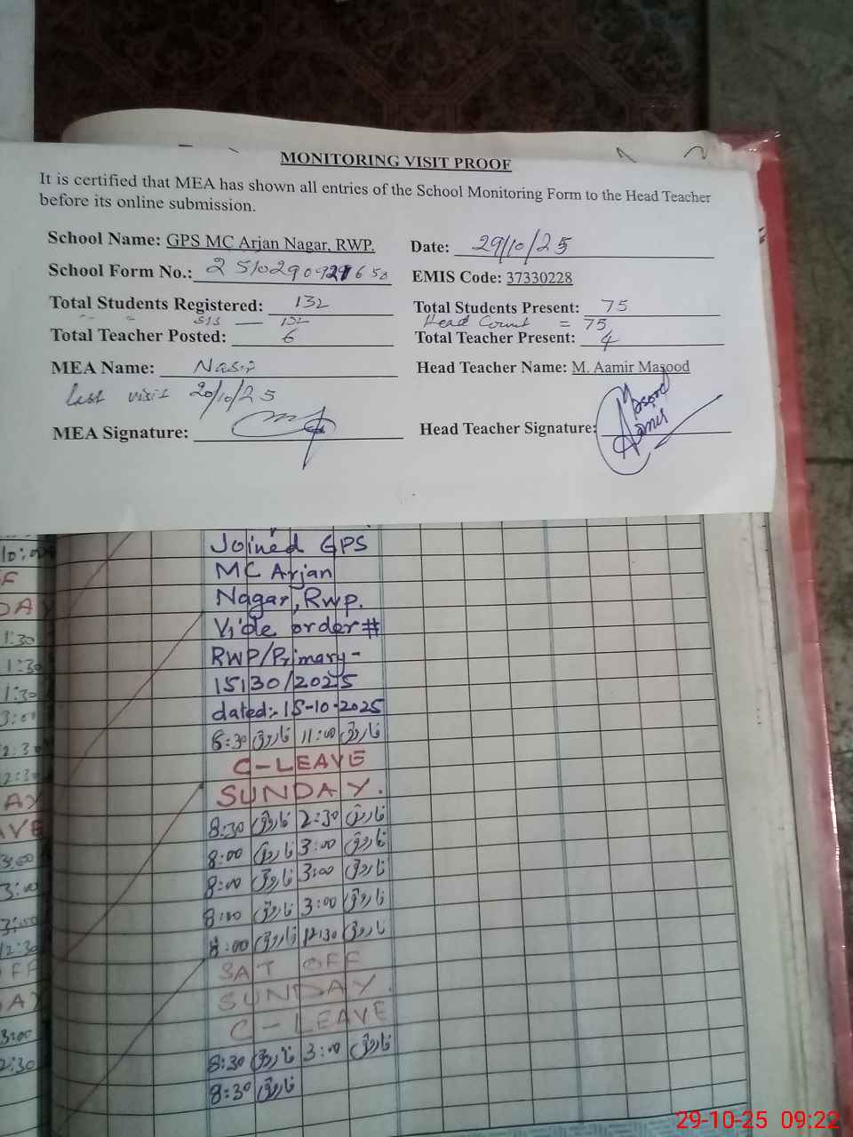 | EMIS Code: 37330228 | Name of School: GPS MC ARJAN NAGAR RAWALPINDI | |||