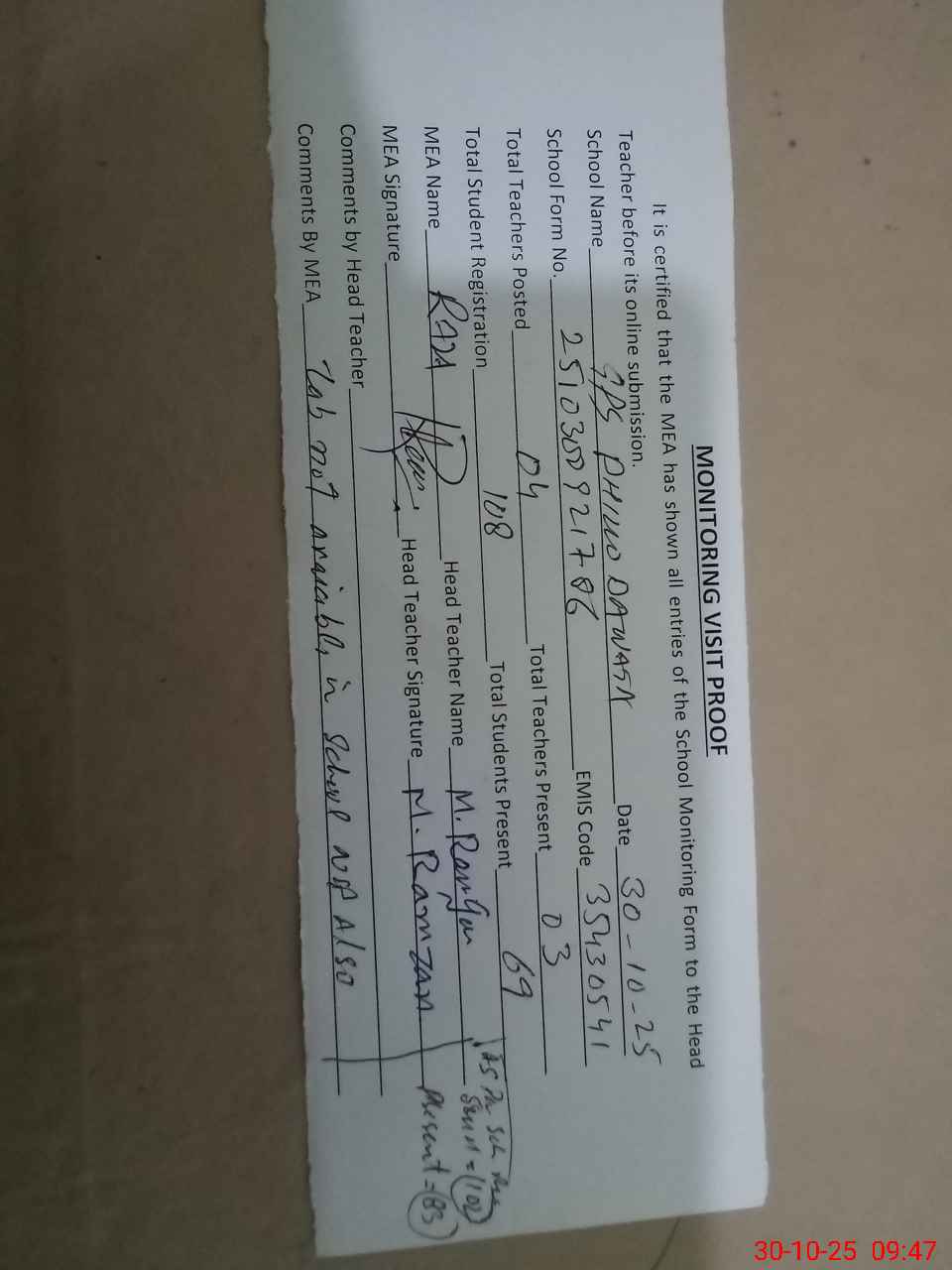 | Attendance Register | Head Teacher | MEA with School | Visit Proof |