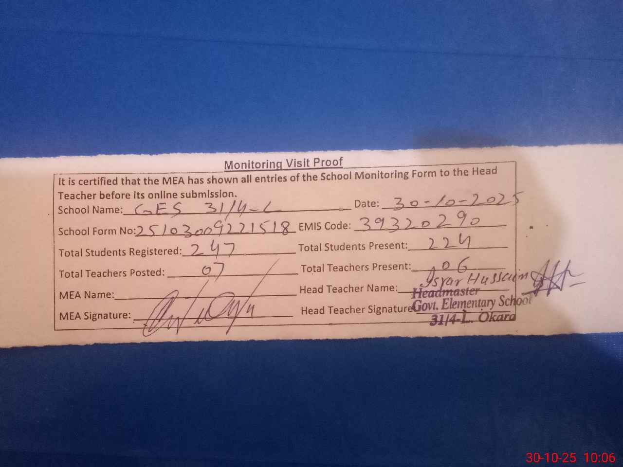| Attendance Register | Head Teacher | MEA with School | Visit Proof |