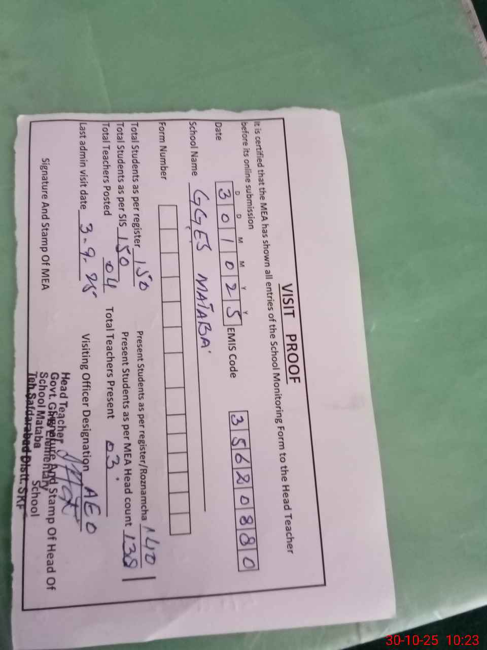 | Attendance Register | Head Teacher | MEA with School | Visit Proof |