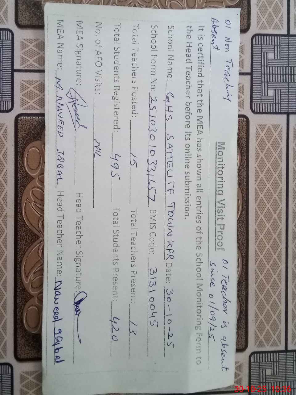 | Attendance Register | Head Teacher | MEA with School | Visit Proof |