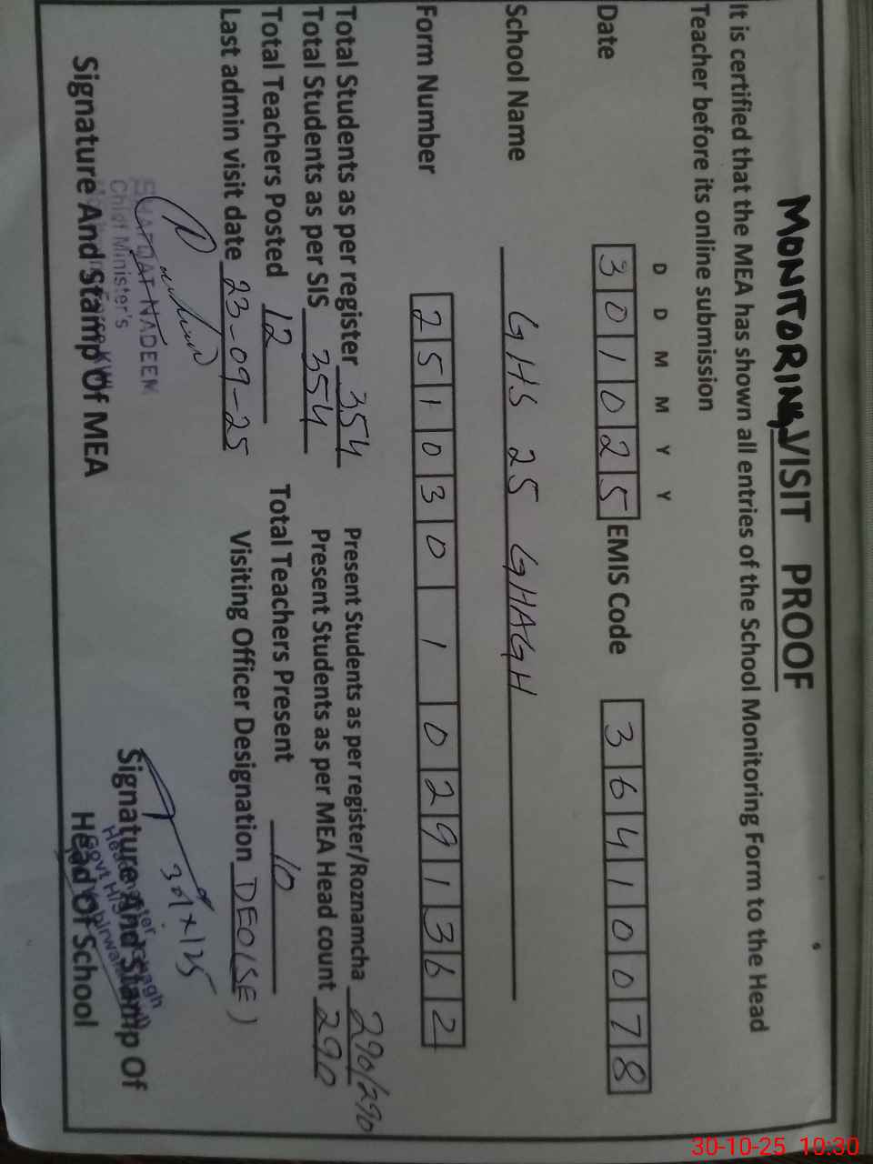 | Certified that this School was Inspected by the Undersigned MEA/DMO Today and the Information Stated Above is as Per Record. | |||||