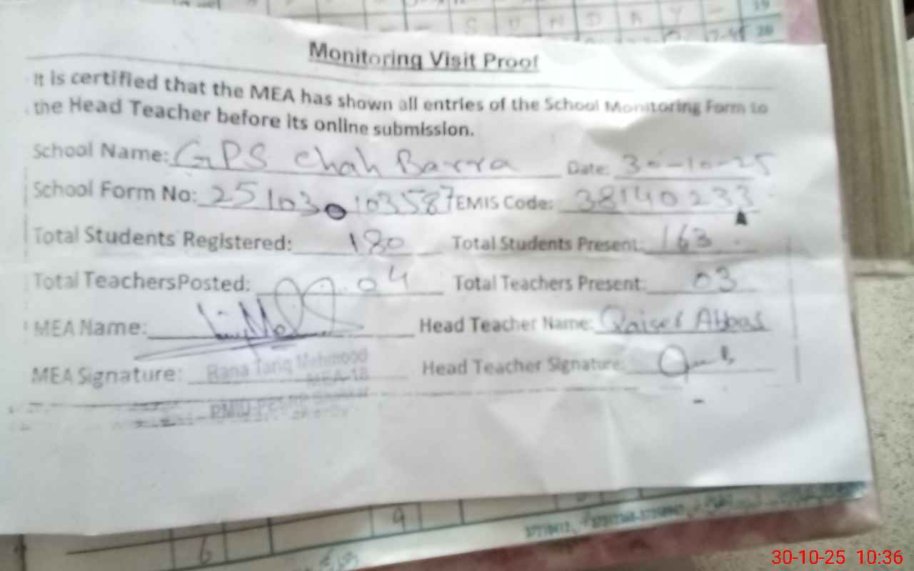 | EMIS Code: 38140233 | Name of School: GPS CHAH BARRA | |||