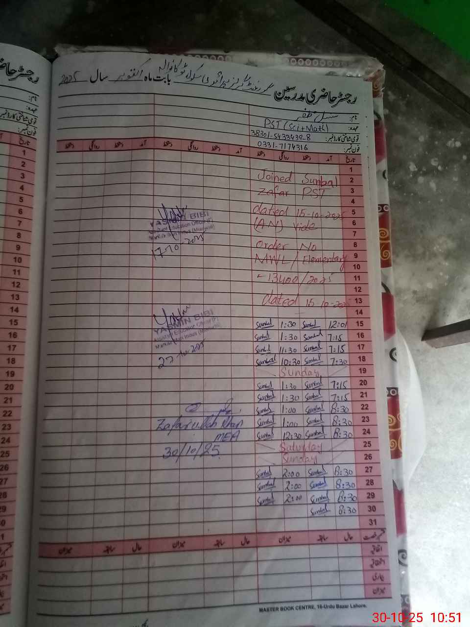| Name: AS**** BA**** Designation: (School Headmaster's/Headmistress's) PST Phone/Cell Number: 03**** |