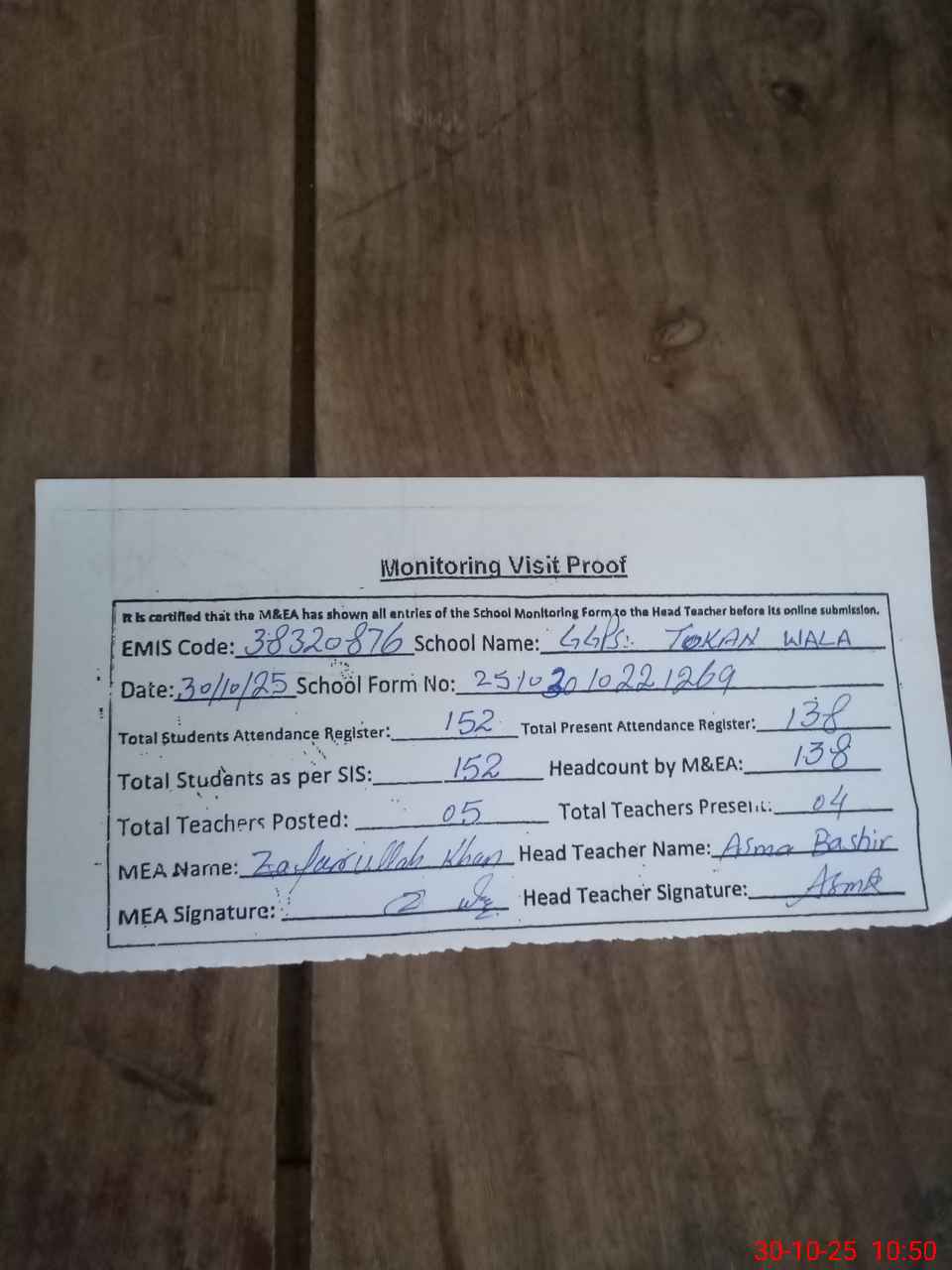 | Attendance Register | Head Teacher | MEA with School | Visit Proof |