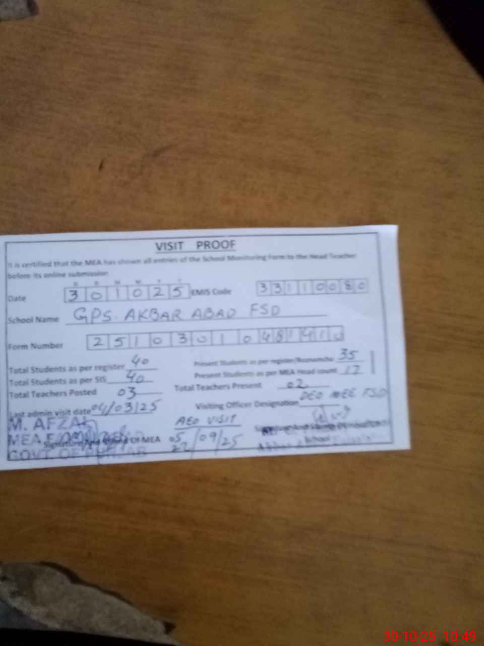 | Certified that this School was Inspected by the Undersigned MEA/DMO Today and the Information Stated Above is as Per Record. | |||||