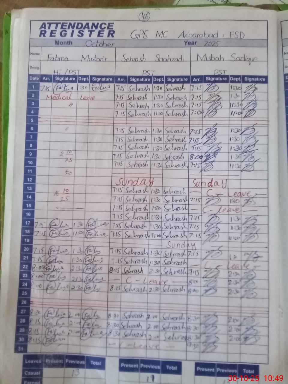 | CNIC | Full Name | Designation | R/C | Absence during last cal. month |