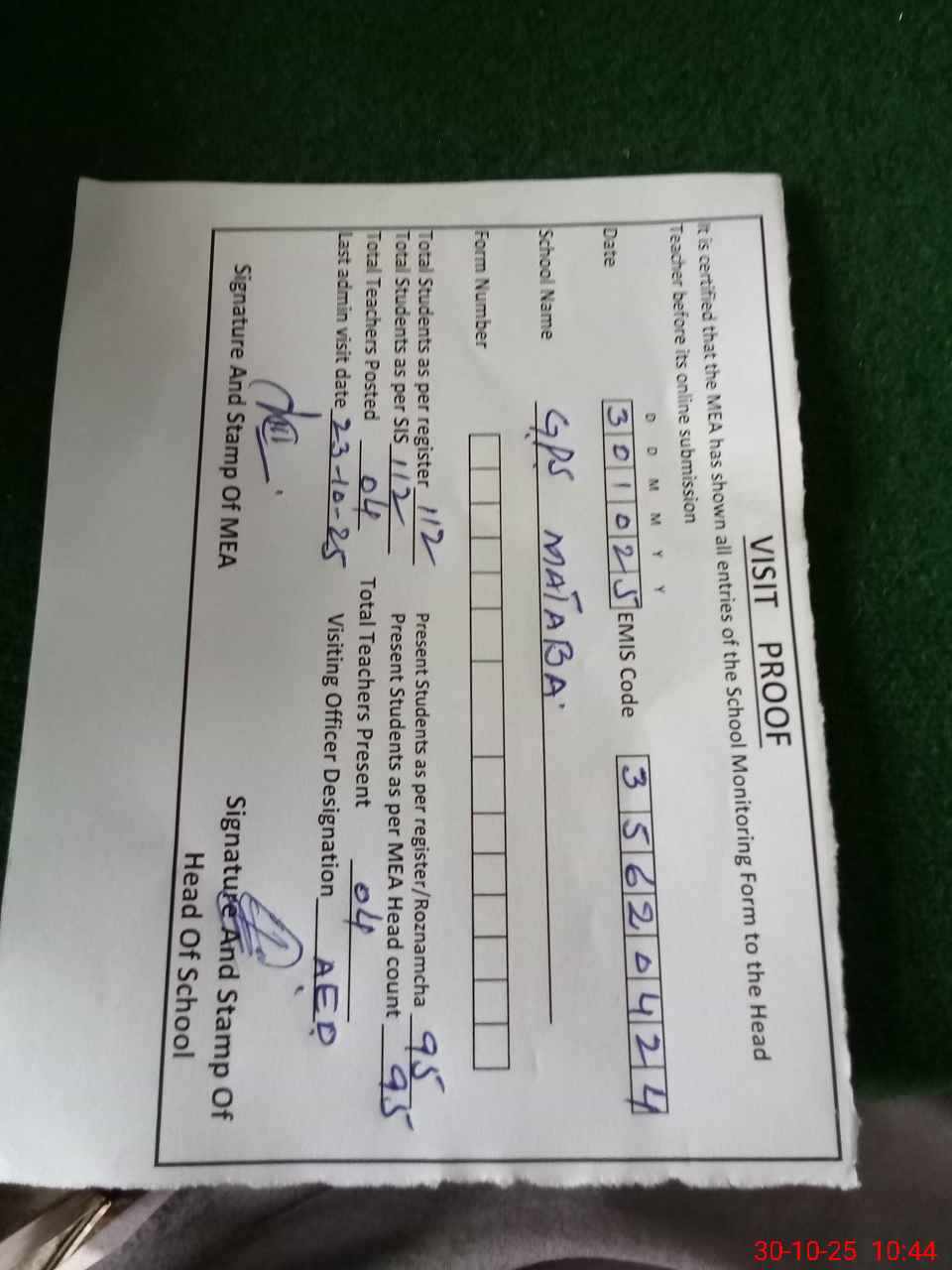 | Certified that this School was Inspected by the Undersigned MEA/DMO Today and the Information Stated Above is as Per Record. | |||||