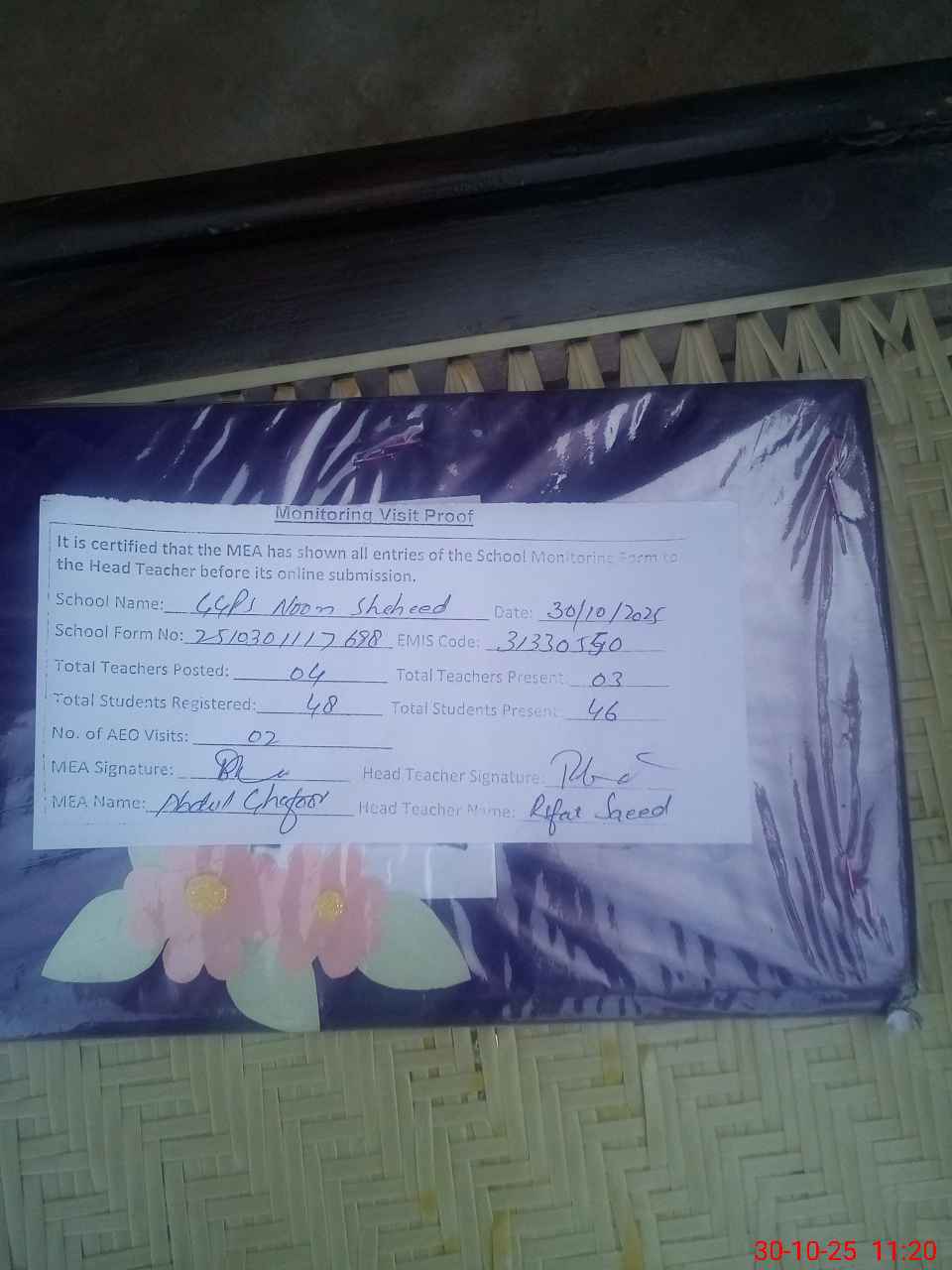 | Attendance Register | Head Teacher | MEA with School | Visit Proof |