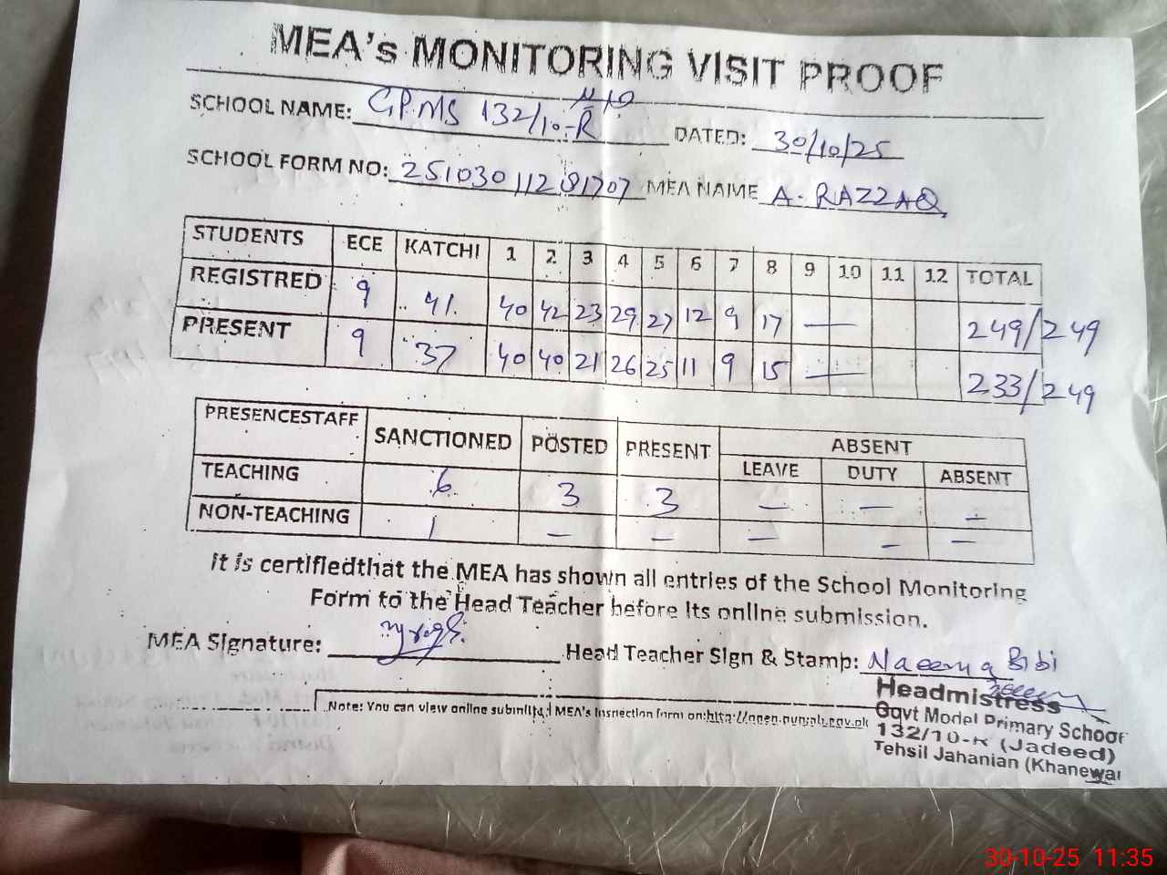 | EMIS Code: 36440483 | Name of School: GPMS 132/10-R JADEED, JAHANIAN | |||