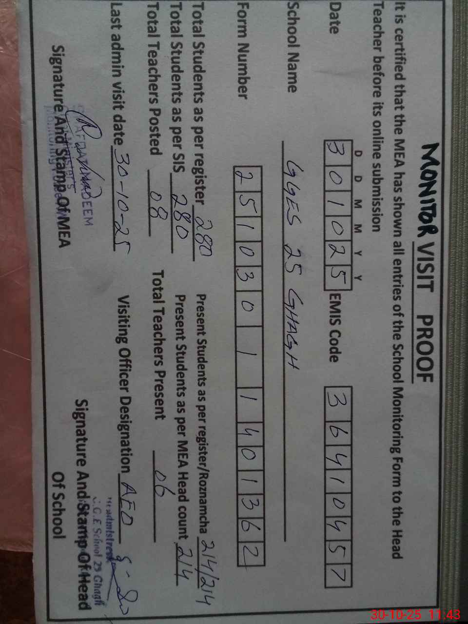 | Certified that this School was Inspected by the Undersigned MEA/DMO Today and the Information Stated Above is as Per Record. | |||||