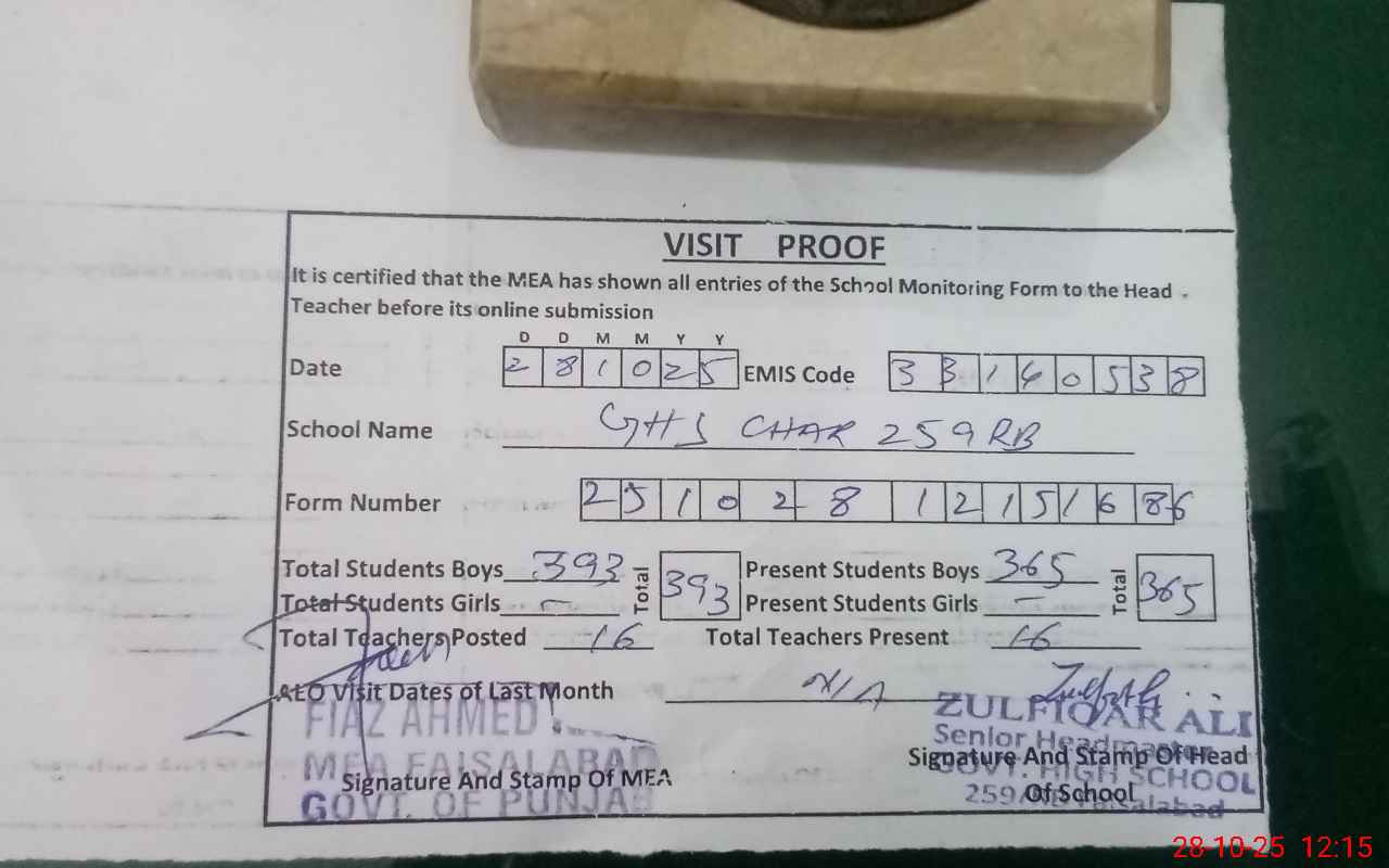 | EMIS Code: 33140538 | Name of School: GHS CHAK 259 RB FSD | |||