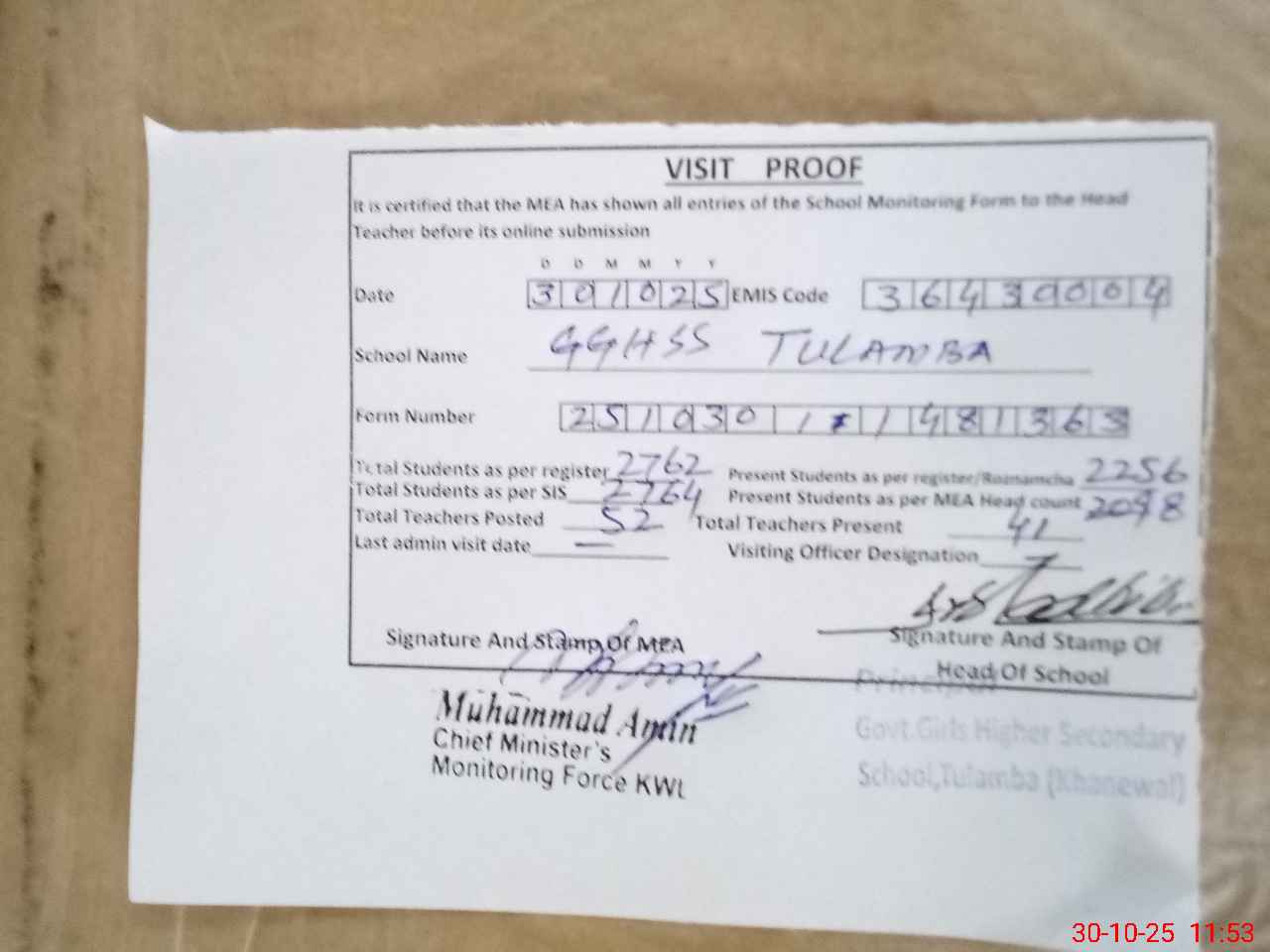 | Certified that this School was Inspected by the Undersigned MEA/DMO Today and the Information Stated Above is as Per Record. | |||||