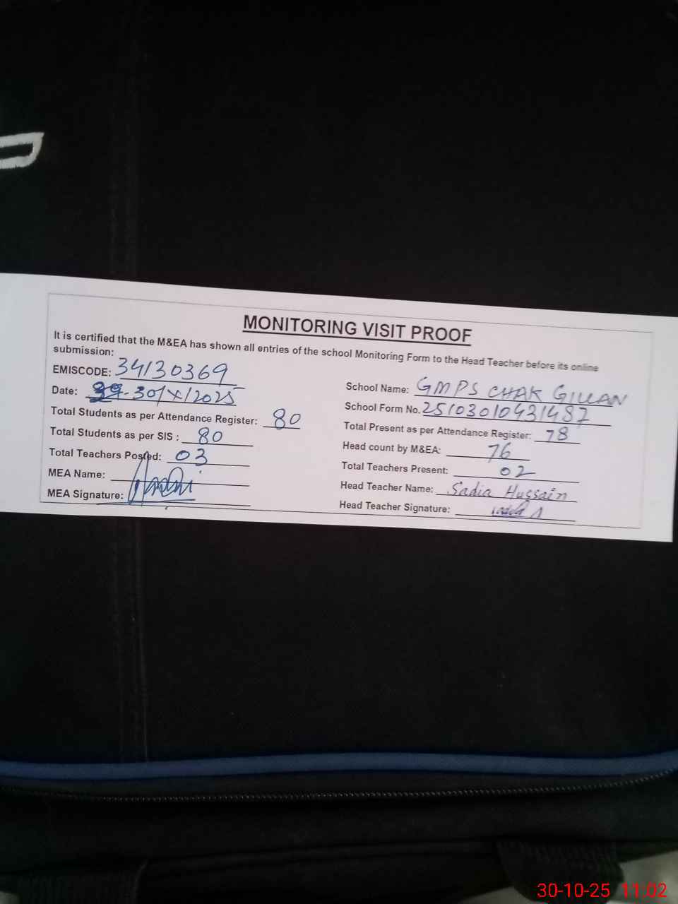 | Attendance Register | Head Teacher | MEA with School | Visit Proof |