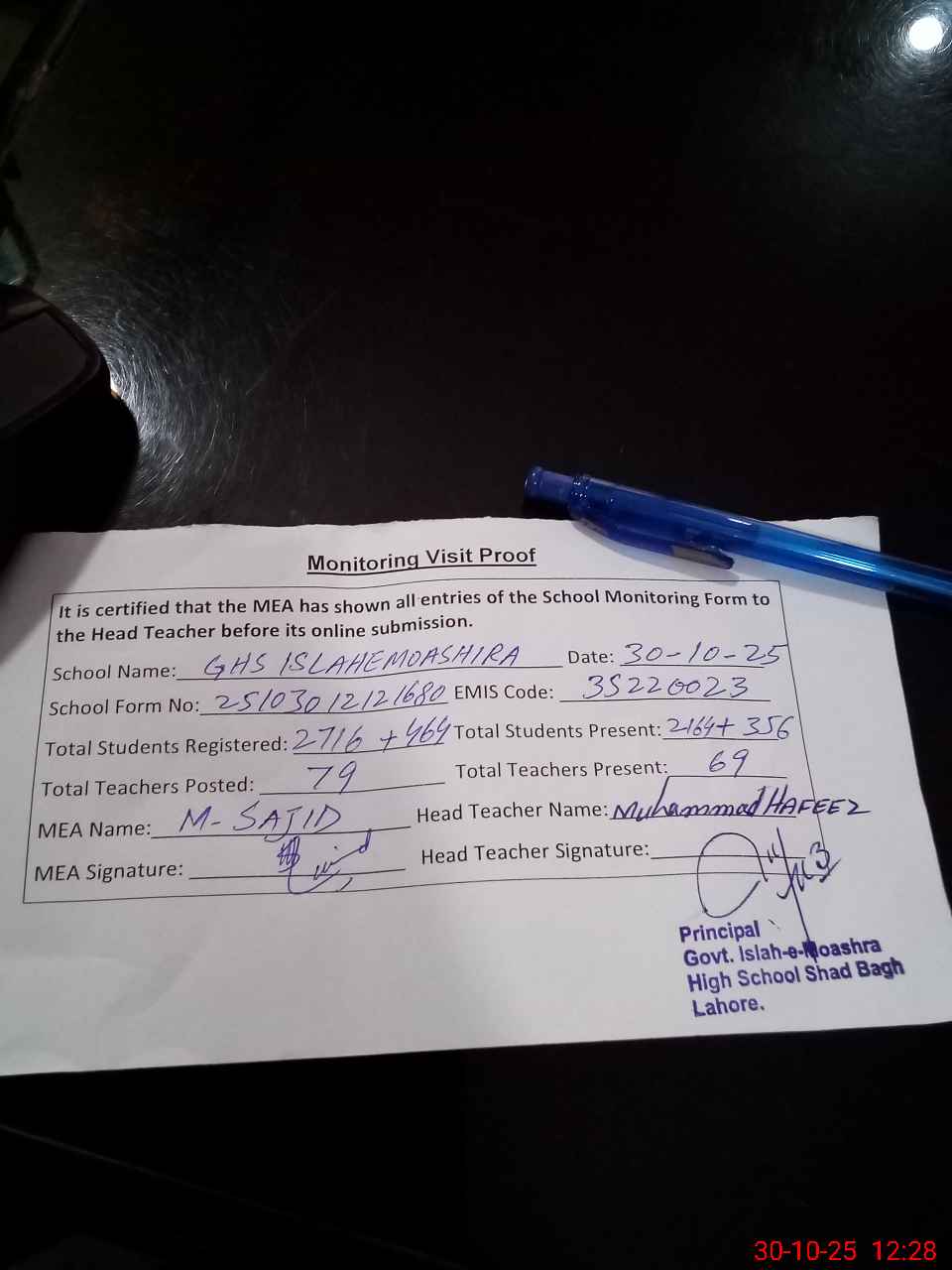 | Remarks (Use Separate Page if Required): PST Amina Shafique is long absent since 21 August 2023 EST Bilal Mahmood Upal is absent since 01 Sep 2025 DEO SE visited this school on 13 Feb 2025 Present students percentage of morning shift is 80 percent Second shift attendance is not marked in Roznamcha on previous day so attendance is noted from 28 Oct 2025 Less number of soaps at hand wash points Roznamcha of morning shift was not prepared 35220023 | |||||