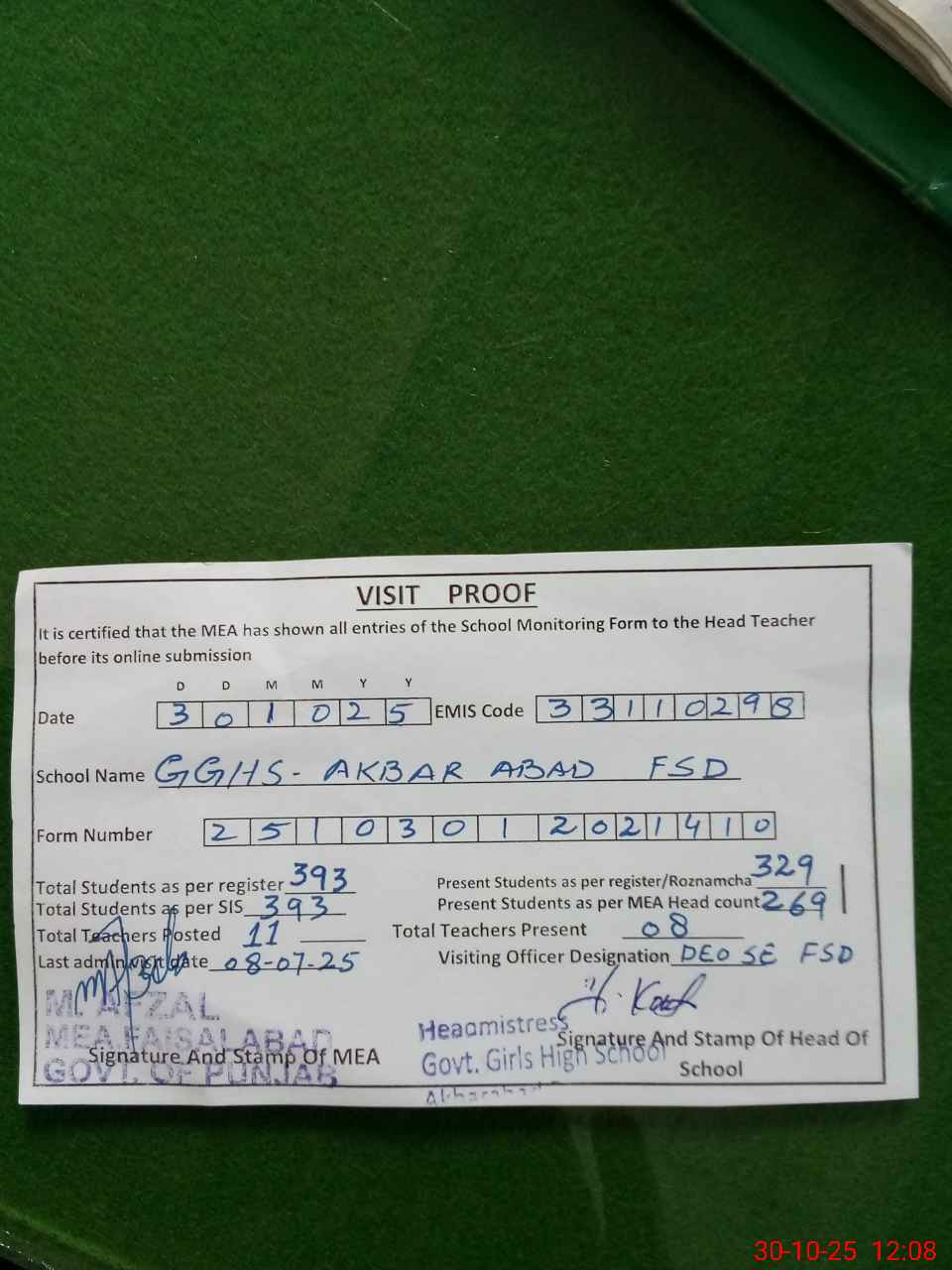 | EMIS Code: 33110298 | Name of School: GGHS AKBAR ABAD FSD | |||
