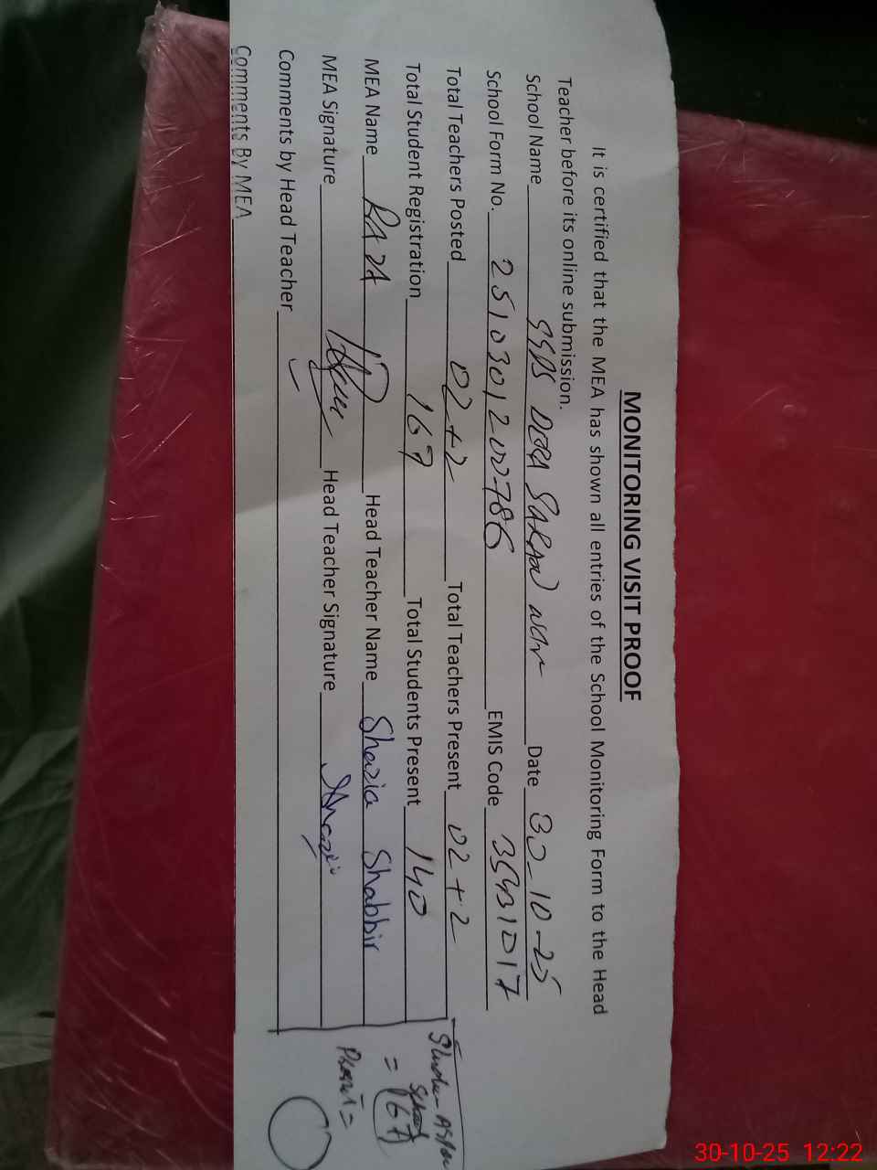 | Attendance Register | Head Teacher | MEA with School | Visit Proof |