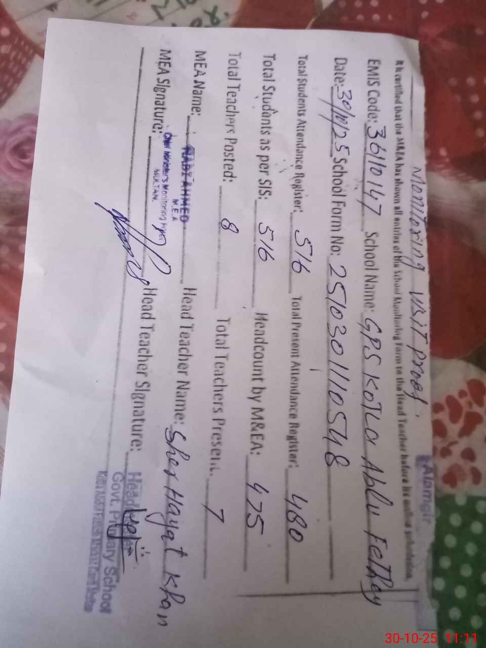 | Attendance Register | Head Teacher | MEA with School | Visit Proof |