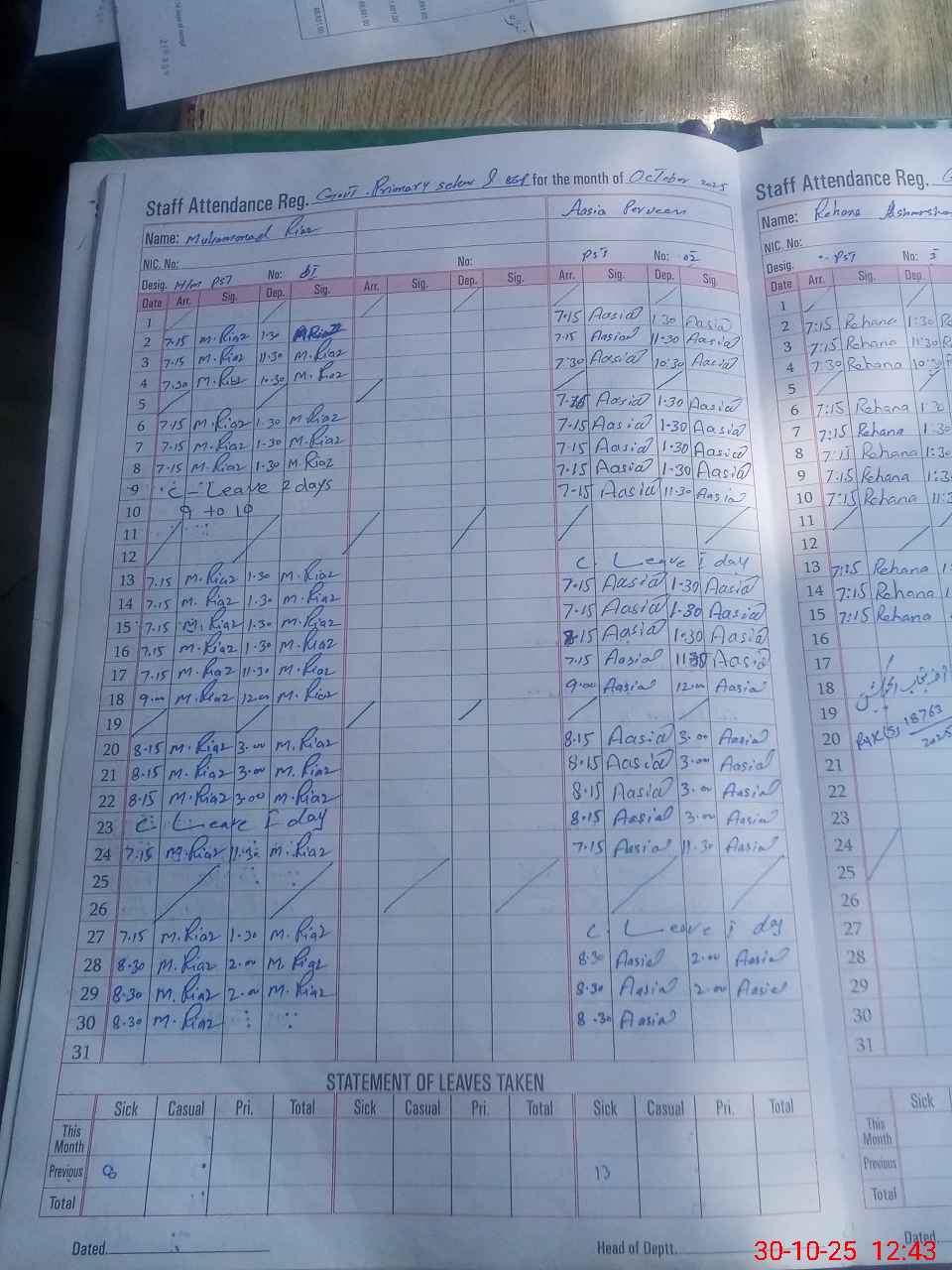 | CNIC | Full Name | Designation | R/C | Absence During Last Calender Month |
