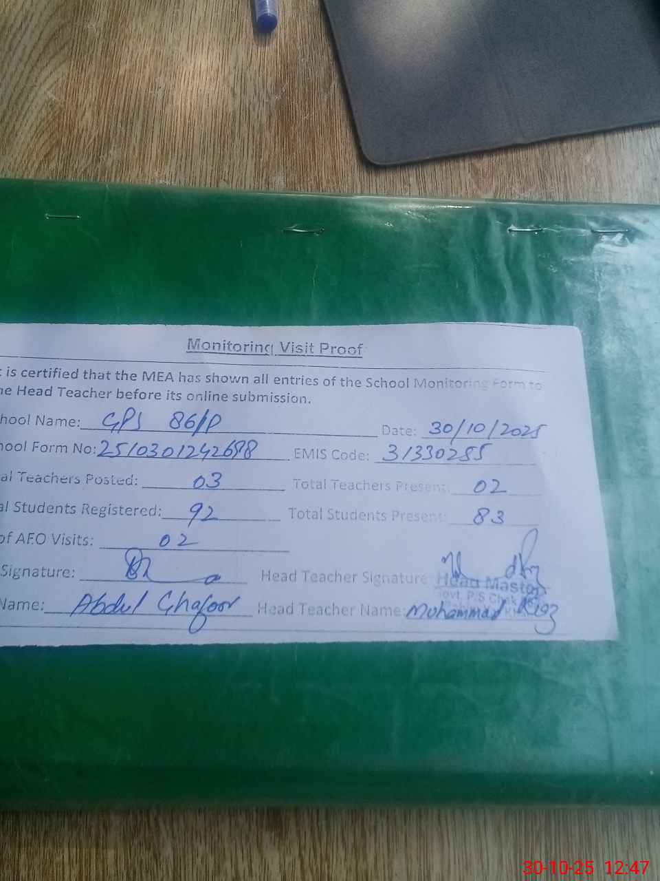 | Attendance Register | Head Teacher | MEA with School | Visit Proof |