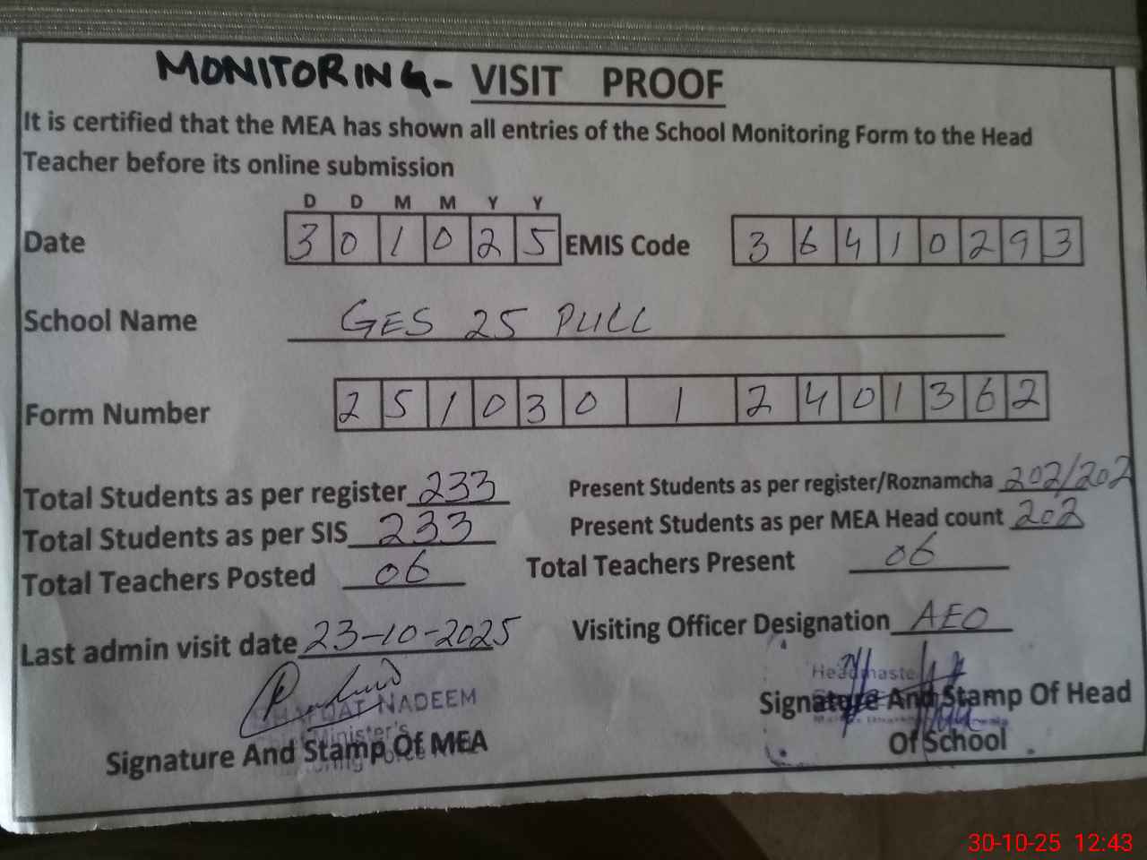 | Attendance Register | Head Teacher | MEA with School | Visit Proof |