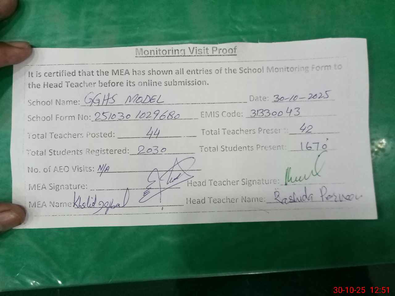 | Attendance Register | Head Teacher | MEA with School | Visit Proof |